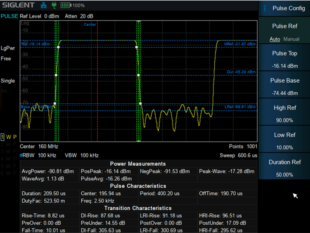 The pulse analysis function featuring 10,001 measurement points to evaluate power, pulse transitions, and signal characteristics using multiple detection modes (positive/negative peak, sample, average, and conventional). This ensures rigorous validation of RF device performance in real-world conditions.